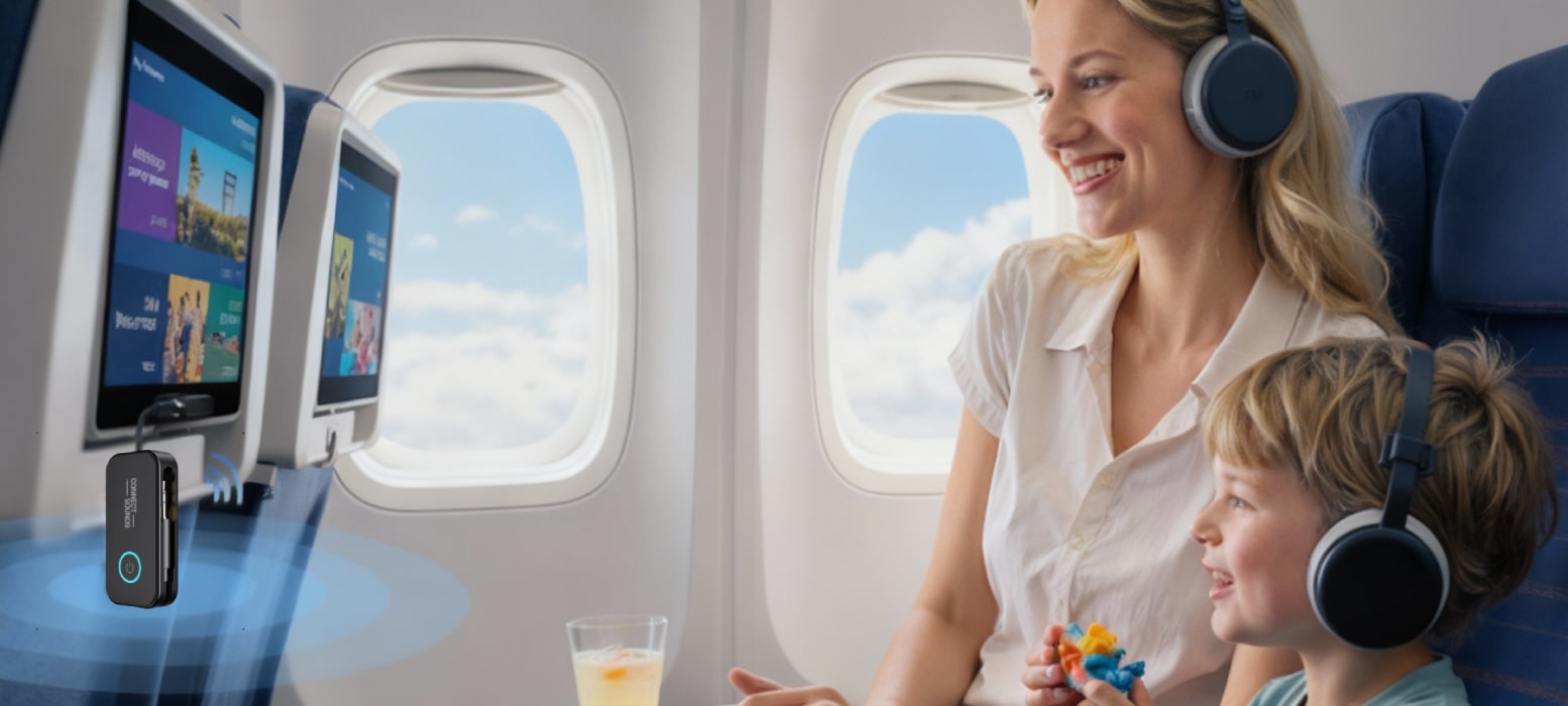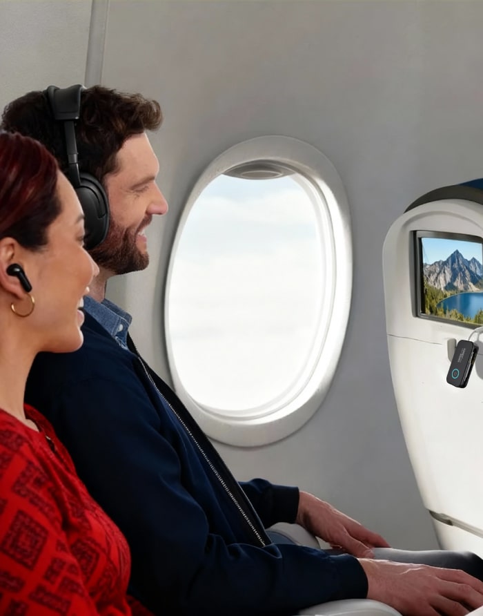 ConnectSounds Bluetooth Transmitter is the ultimate Bluetooth 6.0 transmitter for travellers, letting you stream audio from airplane, gym or seat-back 3.5mm AUX systems to two Bluetooth headphones or earbuds simultaneously. With aptX Adaptive support, up to 20 hours battery life, and onboard controls — cut the cords, keep the quality, enjoy every flight in style.